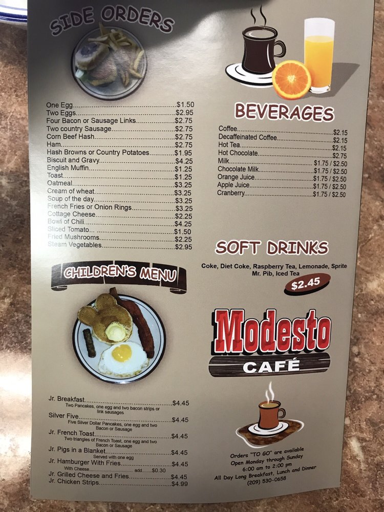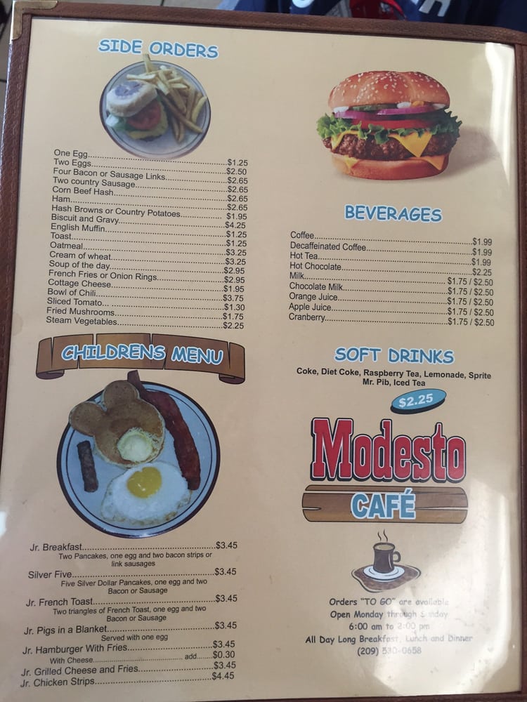 Modesto Cafe, a beloved breakfast and brunch spot in Modesto, CA, offers a delightful dining experience. With a cozy diner atmosphere and friendly staff, Modesto Cafe stands out for its delicious food and excellent service. Customers rave about the wide array of menu options, including tasty omelettes, fluffy pancakes, and flavorful chilaquiles. The restaurant's commitment to accommodating dietary needs and providing top-notch service creates a welcoming and satisfying dining experience for all. From the savory biscuits and gravy to the mouthwatering Spanish sauce on the omelettes, every dish at Modesto Cafe is cooked to perfection. With a focus on quality ingredients and generous portions, this family-run cafe ensures that every guest leaves feeling satisfied and eager to return. Don't miss the chance to experience the warm hospitality and delectable dishes at Modesto Cafe.